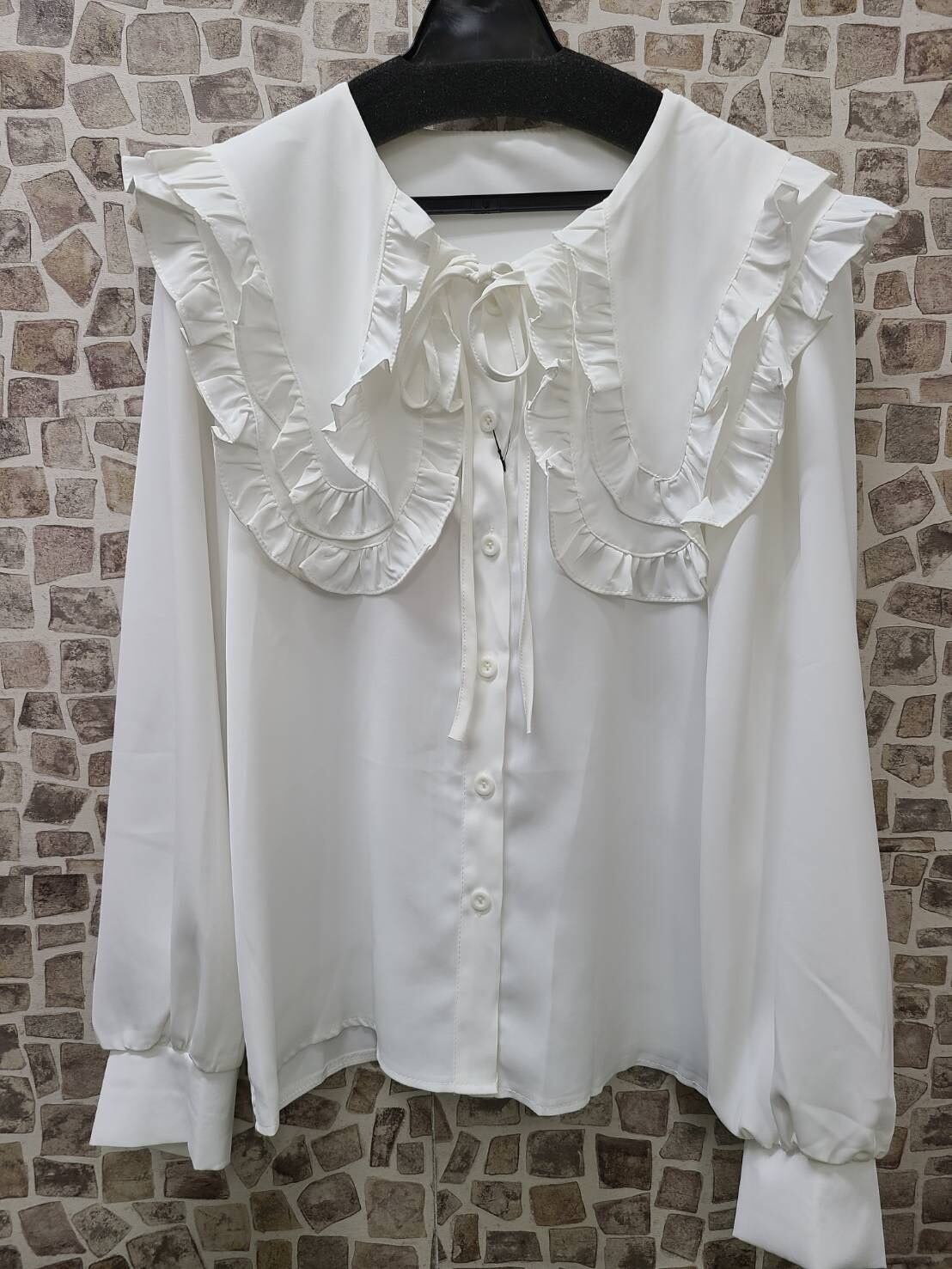フェミニンな印象の襟2重フリルブラウス。上品で可愛らしいデザインが魅力です。首元の2重フリルがアクセントになり、華やかさを演出します。襟元のリボンもポイントで、女性らしい雰囲気を引き立てます。日常のカジュアルなコーディネートから、特別な日の装いまで幅広く活躍します。柔らかな風合いの素材を使用しており、肌触りも良く快適な着心地です。