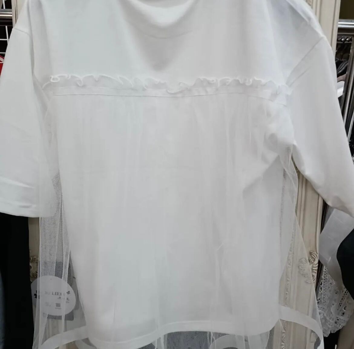 背中のチュールデザインがセクシーで、同時にエレガントな雰囲気を演出するTシャツ。シースルー素材を使用しているので、肌の透け感も程よく、大人の魅力を引き立てます。カジュアルなコーディネートに一押しのアクセントとして取り入れてみてください。着心地も抜群で、一枚でサマになるアイテムです。
