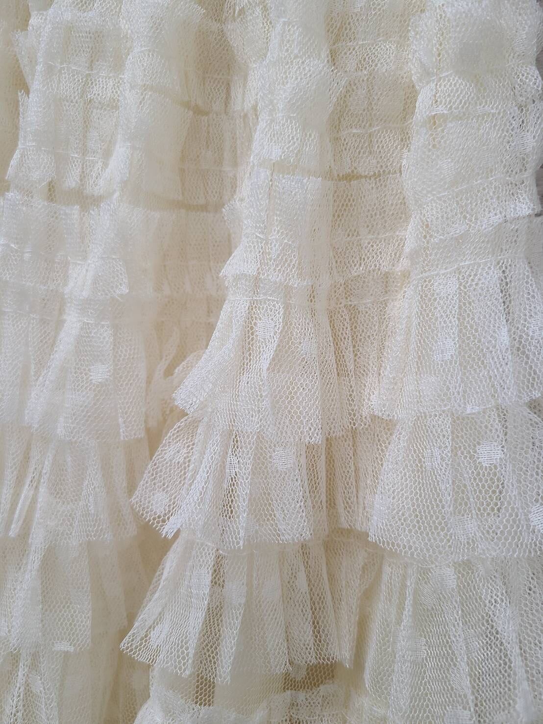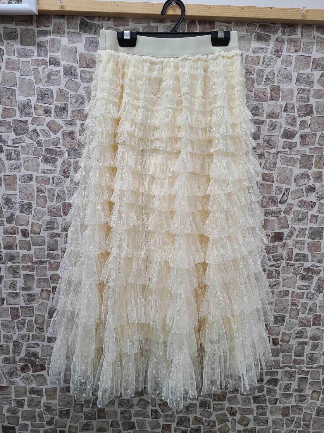 光沢感と軽やかなシルエットが魅力の一枚です。しなやかなチュール素材に、可愛らしいドット柄が施されています。足元に風を感じながら歩くたびに、優雅なフェミニンさを演出してくれることでしょう。